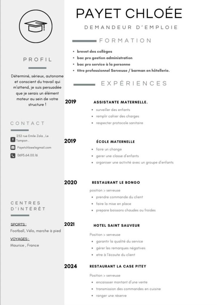 Déterminée, sérieuse et autonome, Chloée Payet possède une expérience variée dans la restauration et le service. Habituée à travailler au contact de la clientèle, elle maîtrise la prise de commande, le service en salle, l’encaissement et la gestion des remarques clients. Grâce à son sens de l’organisation et son écoute, elle apporte dynamisme, professionnalisme et fiabilité dans chacune de ses missions.