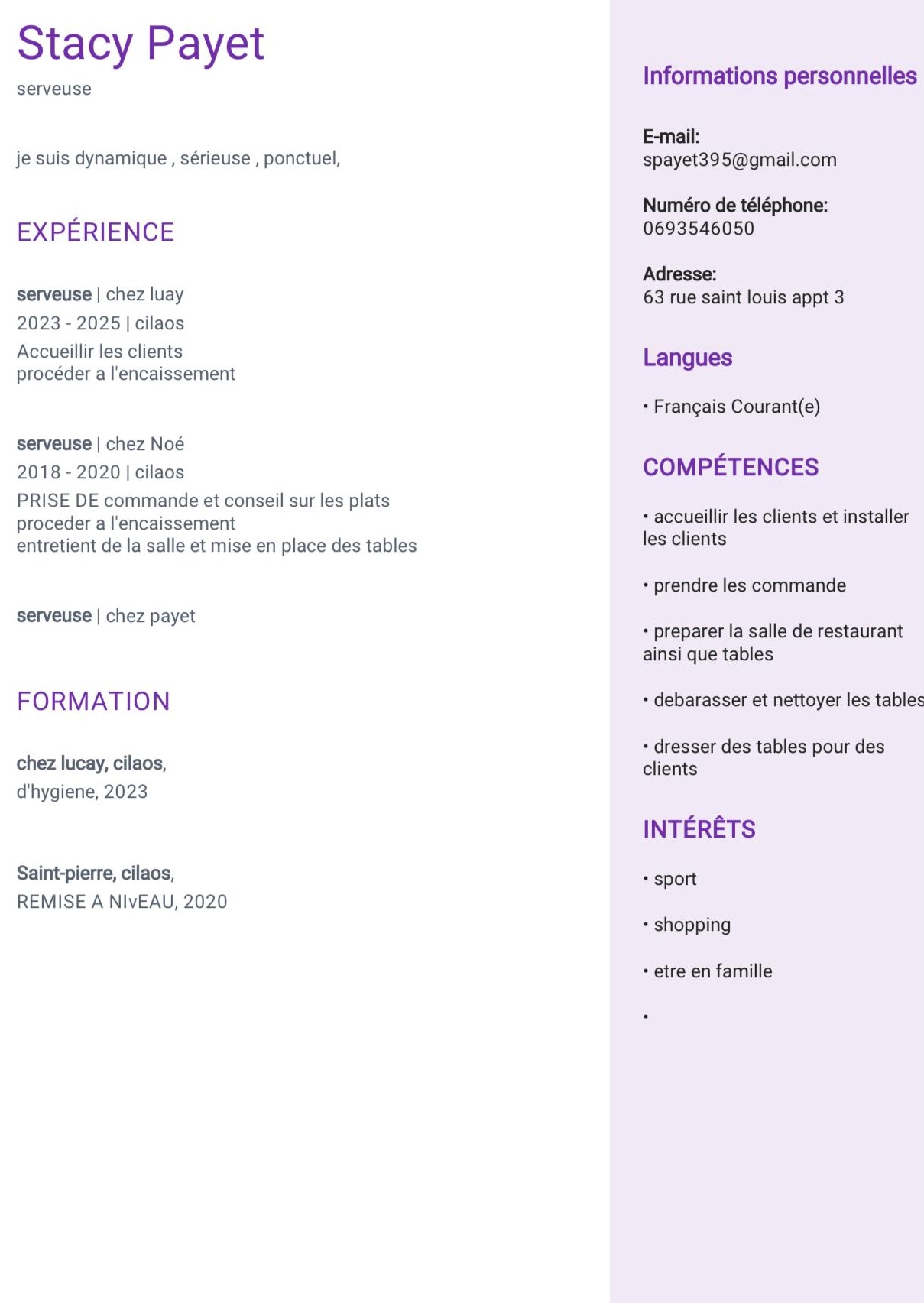 Dynamique, sérieuse et ponctuelle, Stacy Payet dispose d’une solide expérience en tant que serveuse dans différents établissements. Habituée à l’accueil client, à la prise de commande et à l’encaissement, elle maîtrise également la mise en place et l’entretien de la salle. Dotée d’un bon relationnel et d’une réelle rigueur, elle s’investit pleinement pour offrir un service de qualité et contribuer à la satisfaction des clients.