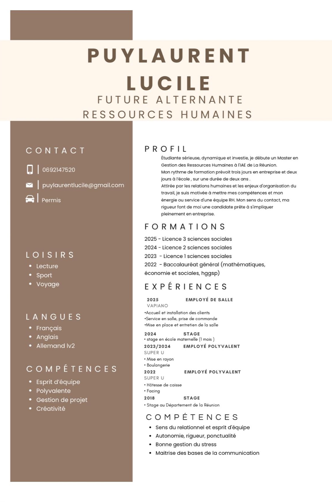 Étudiante sérieuse et dynamique, Lucile Puylaurent débute un Master en Gestion des Ressources Humaines à l’IAE de La Réunion et recherche une alternance pour développer ses compétences. Attirée par les enjeux humains et organisationnels, elle met en avant son sens du relationnel, sa polyvalence et sa capacité à gérer des projets. Rigoureuse, impliquée et dotée d’un excellent esprit d’équipe, elle souhaite contribuer activement au développement et à l’accompagnement des collaborateurs au sein d’une équipe RH.